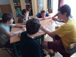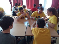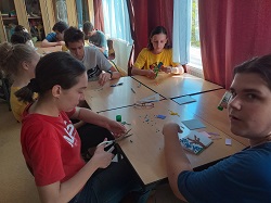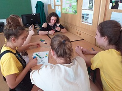 Csoportokat alkotva az asztalok körül elhelyezkedtek a tanulók. Mindenki kitöltött egy játékos energiatudatos keresztrejtvényt, ezzel felmérve, hogy mennyire figyeltek az előadáson. Ezután következett egy kis kreatív munka. Minden csoport egy borítékban előre kiporciózva kapott különböző színű dekor gumit, műszaki rajzlapot, ollót, ragasztót, ill. ragasztópisztolyt. A feladat az volt, hogy készítsenek képet a jelenről és a jövőről (ha nem változtatunk az életmódunkon és így megy tovább). A lapot bármilyen módon megfelezhették.